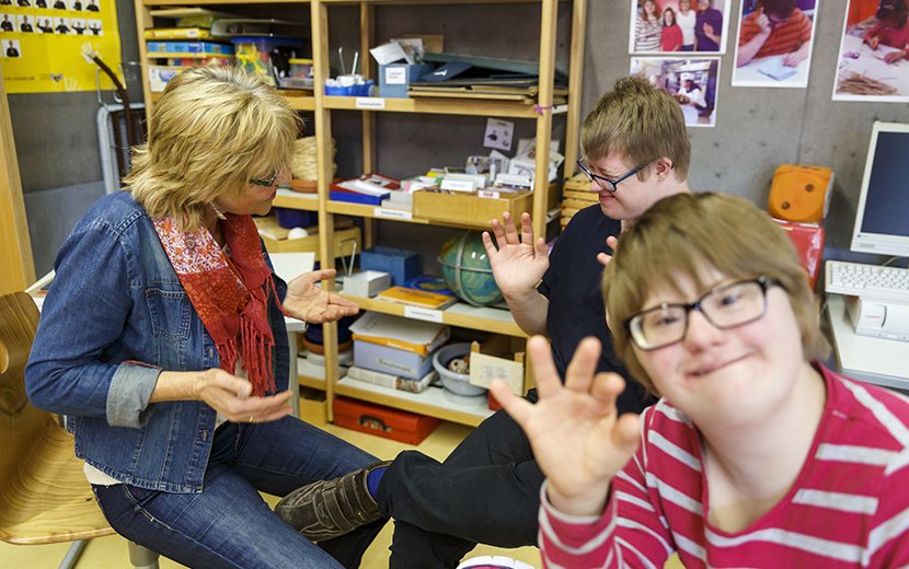 Unsere Mitarbeiterinnen und Mitarbeiter verfügen über besondere Kompetenzen in »Unterstützter Kommunikation« und beherrschen die lautsprachunterstützenden Gebärden aus der Gebärdensammlung »Schau doch meine Hände an«. Das heißt konkret: Lautsprache wird durch vielfältige Maßnahmen und Methoden unterstützt, ergänzt oder ersetzt.
