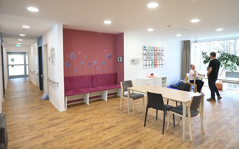 In unserem schönen, modernen Haus am Mühlgarten bieten wir Erwachsenen mit individuellem Betreuungsbedarf ein Zuhause. Das helle, freundliche Gebäude wurde 2020 nach modernsten Standards gebaut und bietet Platz für insgesamt 24 Menschen mit Behinderung. Etwa die Hälfte der Zimmer ist mit eigenem Bad und WC ausgestattet, die anderen teilen sich diese zu zweit. Alle Zimmer verfügen zudem über ein Bett, Regale, Schränke sowie Fernseh- und Internet-Zugang. Unser Haus ist durchgängig barrierefrei.
