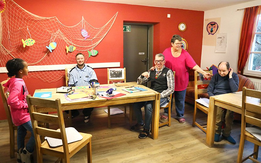 Für die Freizeitgestaltung organisieren wir regelmäßig gemeinsame Aktivitäten wie etwa Ausflüge, Sportangebote, Spieleabende, Singen, zusammen Essen oder auch gemeinsam fernsehen. In den großen und offenen Gemeinschaftsbereichen im Erdgeschoss sowie in der gesamten »Inklusionsgemeinde Wilhelmsdorf« gibt es viele Möglichkeiten zur Begegnung, die gerne genutzt werden.