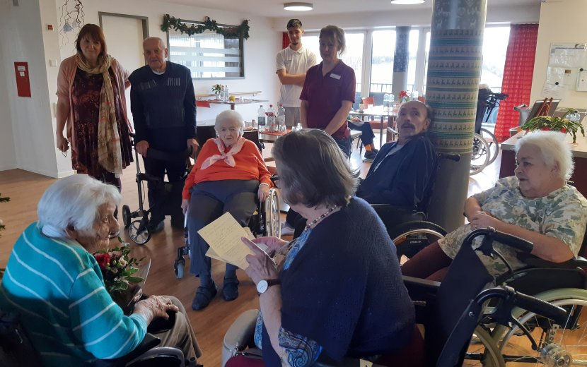 Die Grußkarte hatte ihre Mitbewohnerin Editha Spatzier, 85 Jahre, für Angelika Breski gestaltet und ihr vorgetragen. Gemütlich saßen und standen Bewohnerinnen, Bewohner, Mitarbeitende und die Einrichtungsleiterin Suzana Tica Anfang Januar zusammen, um die Jubilarin zu ehren. Angelika Breski wurde 1921 in Mestin in der Nähe von Danzig geboren. Eine weitere wichtige Station war Duisburg, hier arbeitete sie in einem Hotel. Nach Wendlingen kam die Seniorin, die ihre beiden Töchter schmerzvoll überlebt hat, als es zu Hause nicht mehr allein ging. Ihre Enkelin wohnt in Wendlingen. „Es ist immer wieder etwas Besonderes, einen so hohen Geburtstag miterleben zu dürfen“, erzählt Einrichtungsleiterin Suzana Tica. „Mich beeindruckt, welch positive Lebenseinstellung Frau Breski hat und ich hoffe, wir können ihr hier bei uns im Taläcker noch viel Lebensqualität und eine abwechslungsreiche Zeit schenken.“