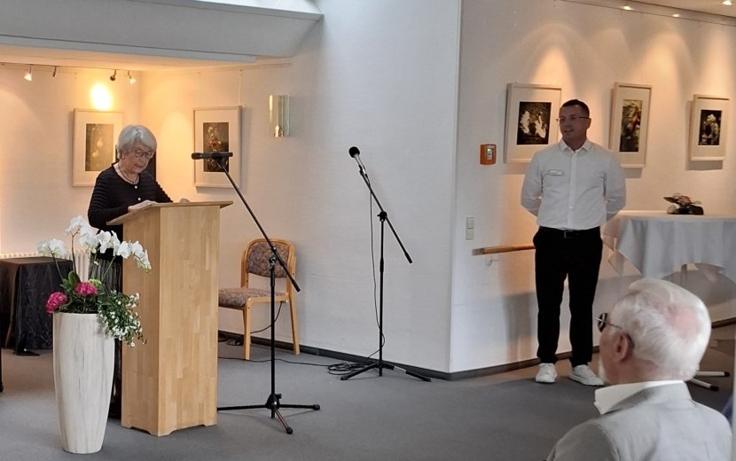 Nach seinem Grußwort folgte der Auftritt von Bewohnerin Helge Medenus, die in Reimform die Wichtigkeit und Umsichtigkeit der Mitarbeitenden im Alltag der Bewohnerinnen und Bewohner würdigte.