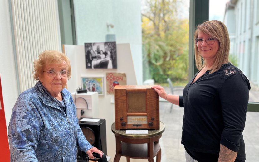 100 Jahre ist Bewohnerin Sigrid Schymura noch nicht alt. Aber die Seniorin kommt beim Betrachten der Volksempfänger ins Erzählen. So berichtet sie ihrer Enkelin Ann-Cathrin Steck von ihrer Kindheit in Hamburg und wie sie mit ihrer Mutter gemeinsam Radio gehört hat. Diese besaß einen Volksempfänger. Die gemeinsamen Rundfunkabende, aber auch die Musiksendungen und Sendungen zur Faschingszeit sind der 80-Jährigen bis heute im Gedächtnis geblieben.