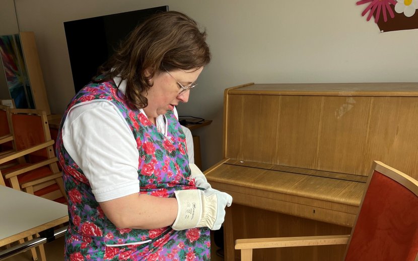 So galt es beispielsweise an Station 1 sich anzukleiden und Knöpfe zu schließen – dabei trugen die Teilnehmenden Handschuhe und mussten nebenher auf 36 zählen. An Station 2 mussten Bilder in der richtigen Reihenfolge sortiert werden, vom Tischdecken, über Kaffee kochen, ein Brot mit Butter und Käse belegen. Hier wurde klar, wie viele einzelne Handlungen pro Tag anfallen, die gesunde Menschen ganz automatisch und selbstverständlich in der richtigen Reihenfolge erledigen. Die vielen einzelnen Fotos aber in die richtige Reihenfolge zu bringen, war gar nicht so einfach.