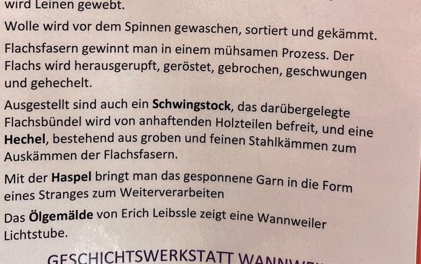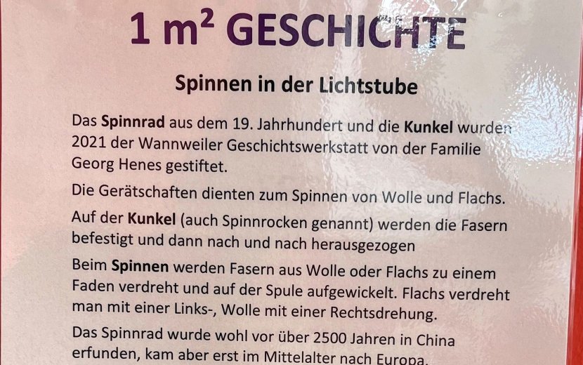 Gleich wenn man den Eingangsbereich der Pflegeeinrichtung betritt, sieht man die historischen Gegenstände: Auf einem 1-qm großen Podest stehen aktuell ein Spinnrad, eine Kunkel, ein Schwingstock, eine Hechel und eine Haspel. Die Gegenstände aus dem 19. Jahrhundert geben zusammen mit einem Ölgemälde von Erich Leibssle einen Einblick in eine Wannweiler Lichtstube. Genaugenommen, wie vor über 100 Jahren in vielen Haushalten der Gegend Wolle und Flachs versponnen wurden. Neben den ortsansässigen Webereien war das Spinnen zum damaligen Zeitpunkt die wichtigste Tätigkeit.