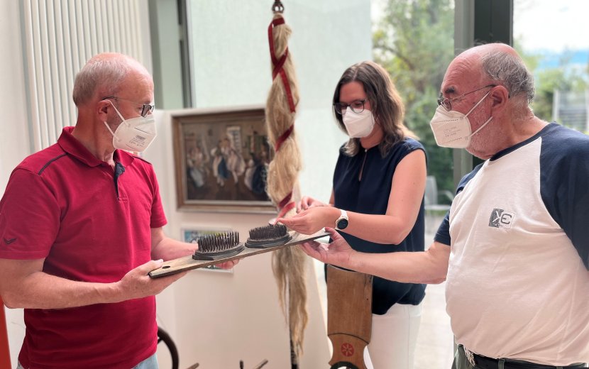 Durch ihre ehrenamtliche Arbeit im Seniorenzentrum der Zieglerschen haben Walter Ott und Hauke Petersen eine langjährige Verbindung zur Pflegeeinrichtung. Und so war die Idee, den Bewohnerinnen und Bewohnern mit einer Wechselausstellung den Alltag interessanter zu gestalten, dank der professionellen Umsetzung durch den ehemaligen Schreiner Walter Ott schnell realisiert. Auf einem Podest von nur einem Quadratmeter Fläche werden zukünftig historische Gegenstände ausgestellt. Der Geschichtswerkstatt ist wichtig, dass das Wissen um die Sachen erhalten bleibt. Liebevoll und einfach erklärt, können die Seniorinnen und Senioren, Angehörige und Gäste des Seniorenzentrums „Haus in der Dorfmitte“ auf einer Schautafel neben der Ausstellung nachlesen, um welche Gegenstände es sich handelt. Und natürlich wird auch erklärt, welche Aufgabe diese Sachen damals hatten.