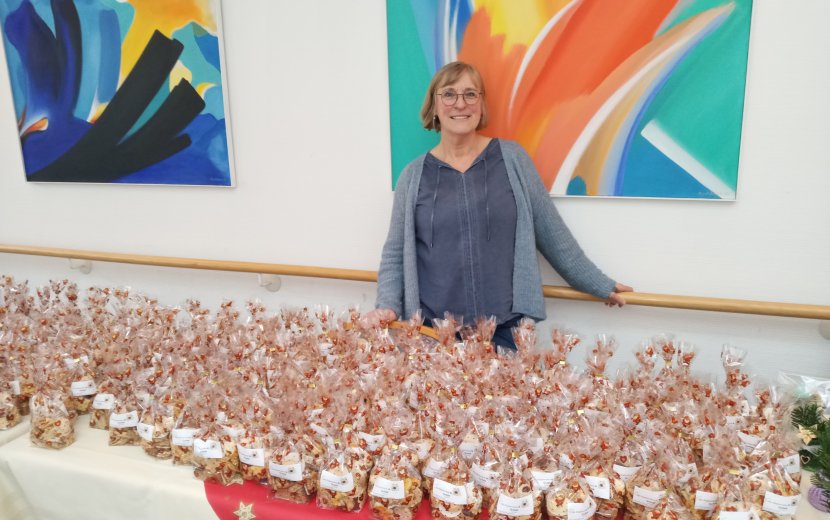 Gebacken hatten die Gutsle in bewährter Weise das "Backteam", das aus sechs Bewohnerinnen und drei ehrenamtlichen Mitarbeiterinnen besteht und sich unter der Regie von Koordinatorin Dorothea Haas alle Jahre wieder trifft. Dann werden die bewährten Rezepte aus der Schublade geholt und es wird fleißig gebacken. Dieses Jahr entstanden 200 Tütchen mit Gutsle, liebevoll verpackt und beschriftet und innerhalb von 90 Minuten ausverkauft!