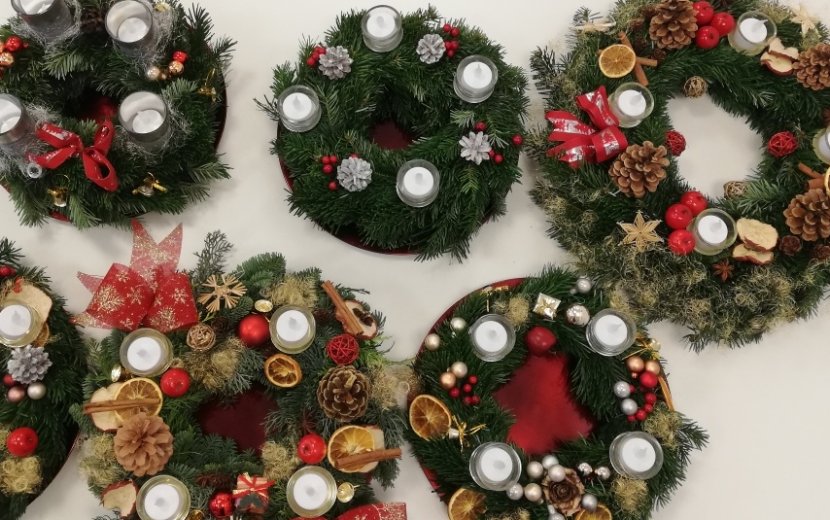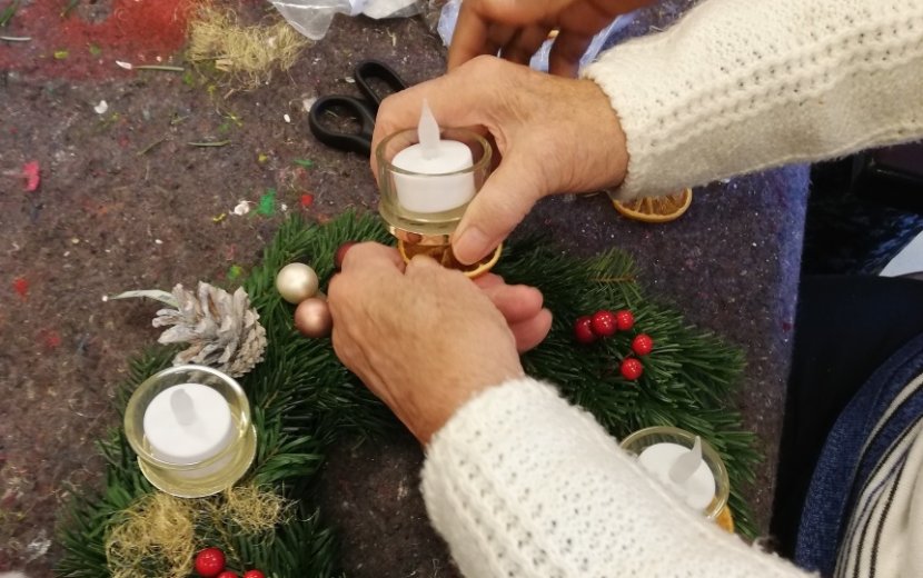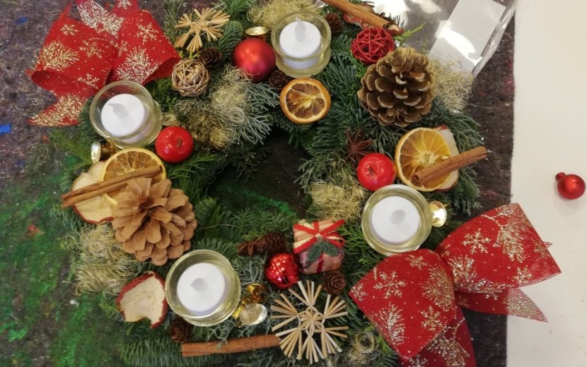Gerda Siebenlist hatte Tannengrün und Koniferen gespendet, so konnten sich alle schöne Äste aussuchen und der Duft von Tannengrün durchzog den Raum. Neben dem geschäftigen Treiben kamen die Erinnerungen an frühere Weihnachtsfeste auf, es entstanden viele Gespräche über Weihnachten und Weihnachtsbräuche, sogar erste Weihnachtslieder wurden angestimmt. Mit viel Freude und großer Begeisterung wurden im Anschluss die fertigen Werke begutachtet. Dabei stellten die Teilnehmer erstaunt fest, wie individuell und schön jeder Kranz und jedes Gesteck geworden war. "Und dann haben wir sie auf den Wohnbereichen verteilt! Die Kolleginnen, Kollegen und Bewohner waren dankbar und überrascht und nahmen uns die Kränze freudig ab. Jetzt haben wir hier zusammen eine richtig schöne Weihnachtsstimmung geschaffen", erzählt Janine Moldaschl.