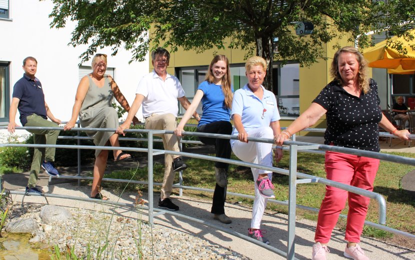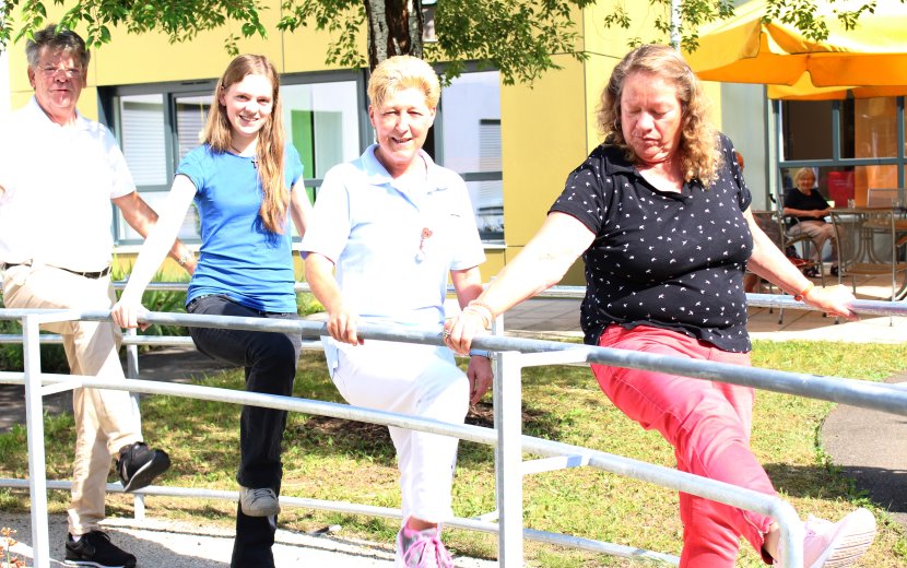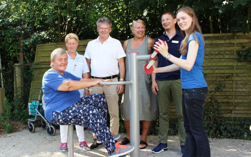 Ellen Streicher sitzt gut gelaunt im Garten des Henriettenstifts und tritt fleißig in die Pedale. Die Seniorin genießt den Schatten und die frische Luft und die Möglichkeit, die ihr der neu aufgebaute Rad-Trainer bietet. An einer nächsten Station, gleich neben dem Teich, können mehrere Senioren unter Anleitung von Betreuungsmitarbeiterin Gunhild Janka Balance-Training machen. Hier wurde ein neues Geländer moniert, so dass sich jeder nun mit beiden Händen festhalten kann. „Dieses Gefühl der Sicherheit hat Bewohner dazu gebracht, bei meinem Balance-Training mitzumachen, die sich bisher nicht getraut hatten“, berichtet Gunhild Janka erfreut. Der Rad-Trainer, das neue Geländer und die Installation wurden mit Hilfe der Firmen Grün-Teck GmbH, Stahlbau Ott GmbH und Ko KG und Thiede Landschaftsarchitekten durchgeführt. Die Kosten von rund 14.100 Euro hat der Freundeskreis Henriettenstift e.V. getragen. Wenn sich das Konzept des Fitnesstrainings im eigenen Garten bewährt, sollen drei weitere Geräte angeschafft werden. Dafür wurden bereits drei schöne Plätzchen im Garten bestimmt und eine Summe von weiteren 19.000 Euro in Aussicht gestellt.