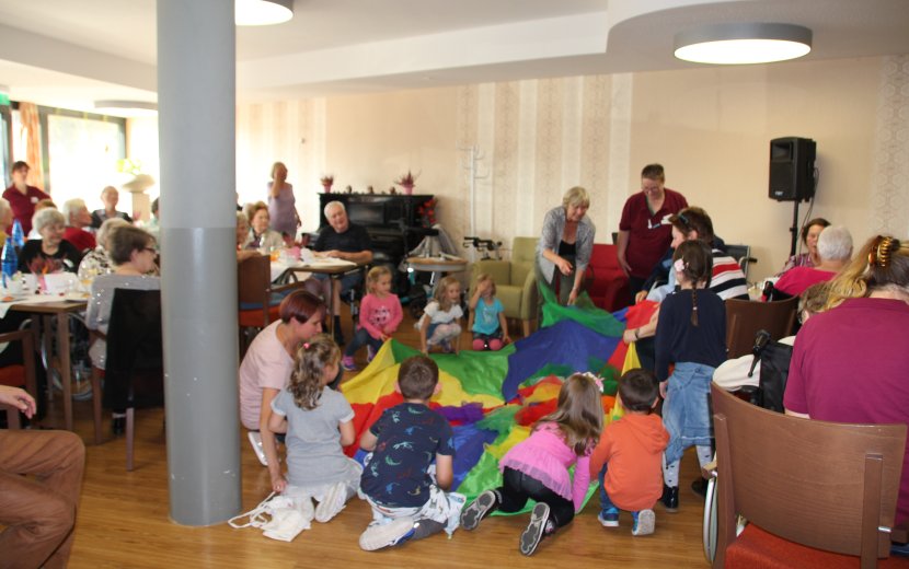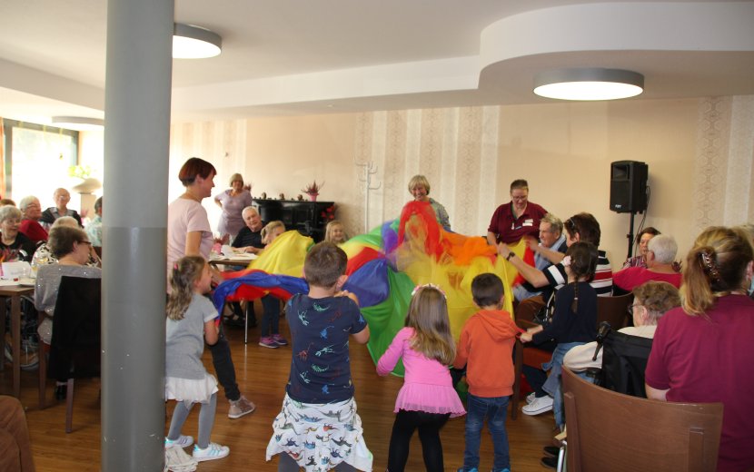 Auch Angehörige feierten mit, darunter ein paar Enkel und ein ganzer fröhlicher Haufen vom Kindergarten Alleenstraße mit ihrer Leiterin Astrid Blankenhorn. Die Kinder beglückten mit ihren Liedern und dem bunten Fallschirmtuch die Senioren und verteilten Äpfel. „Ein Programmpunkt mit Kindern kommt einfach immer gut an“, freute sich Nathalie Wiedmann, Leiterin der Sozialen Betreuung. Und Lisa und Hannes von der Jugendkunstschule Nürtingen rundeten mit ihren wunderbar gespielten Sketchen das Programm ab.
