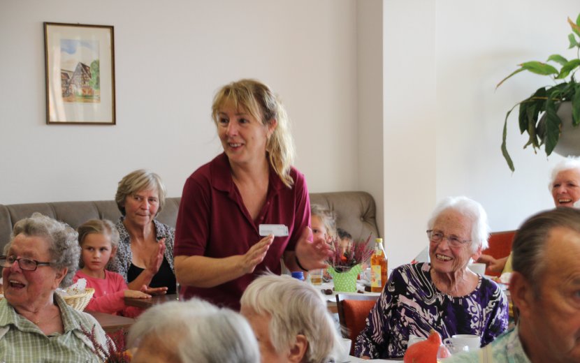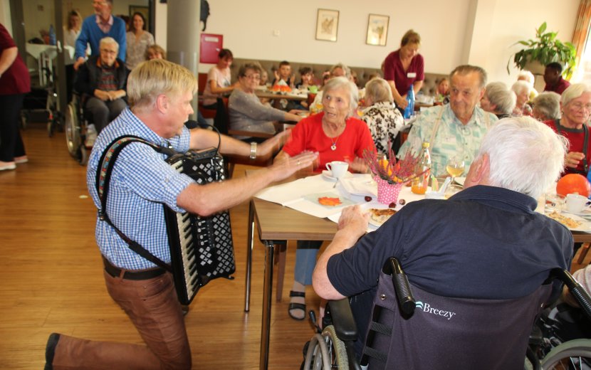 Hier wurde geklatscht, dort gewippt, von ganz hinten mitgesungen. Sogar das Tanzbein wurde geschwungen, der Rollator bewegt oder im Rollstuhl vor und zurück gerollt. Manche Bewohner saßen ruhig da und ließen sich Zwiebelkuchen, Zwetschgenkuchen, Neuen Wein oder den Kaffee schmecken. Einer Seniorin war es einfach zu laut, sie verließ den Saal – auch das gehört zu einer möglichst großen Selbstbestimmung im Pflegeheim mit dazu.