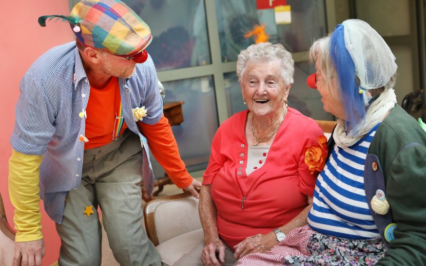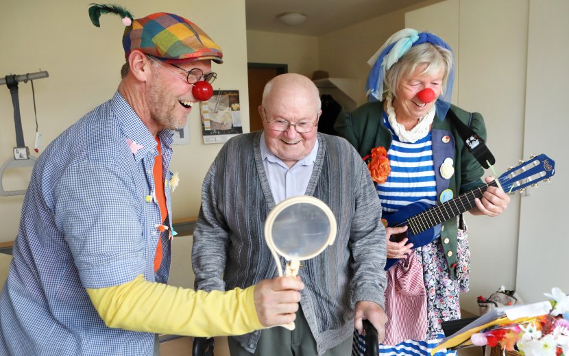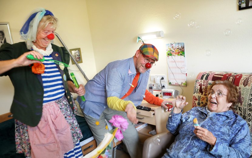 Mit ihren Besuchen bringen die beiden Klinik- und Pflegeheimclowns Freddy und Lotte Lachen und Lebensfreude ins Seniorenzentrum „Haus in der Dorfmitte“.