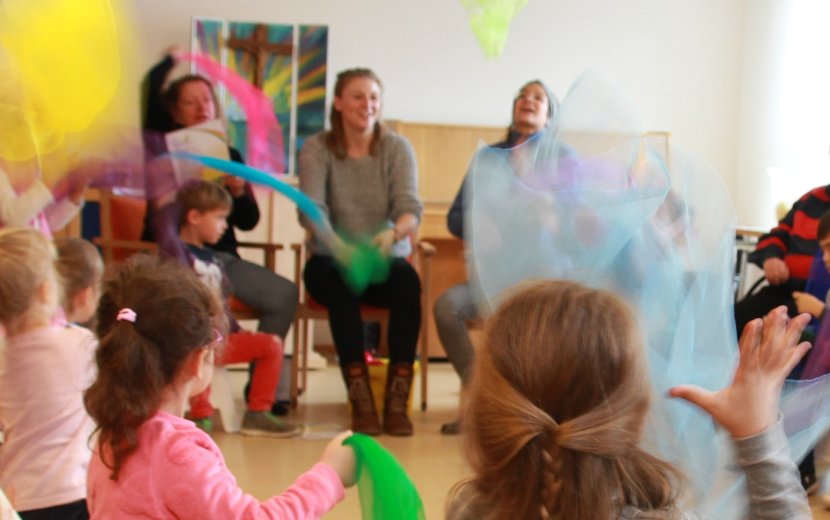 Unter Anleitung von Luisa Drop und Eva Grafmüller vernetzten sich die Anwesenden miteinander, massierten sich mit Bällen, führten Yogaübungen durch, sangen und scherzten miteinander. Ob vier Jahre oder über Hundert, alle hatten ihren Spaß und genossen das Zusammensein und die bunten Tücher, die allen tatsächlich das Gefühl gaben, in einem Regenbogenland zu sein.