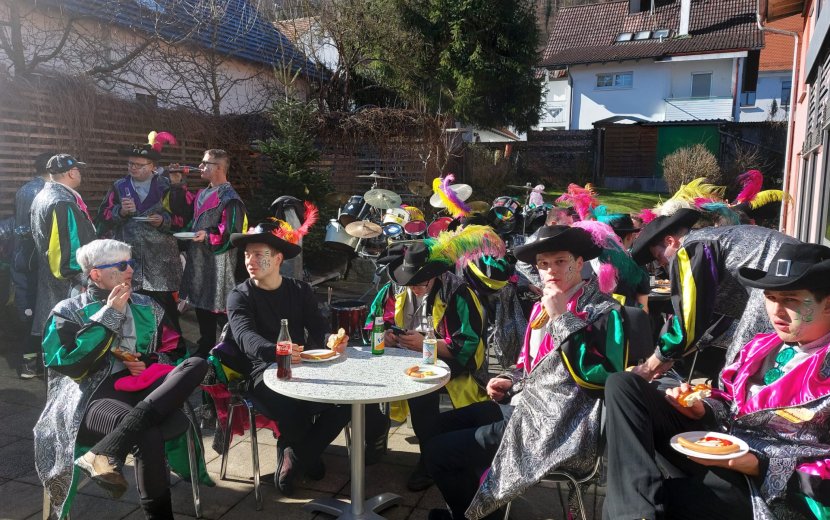 Wer es lieber deftig mag, bekam oberschwäbischen Kartoffelsalat mit Leberkäs und Soß. Und auch auf den Spielmannszug mit seinen Cheerleadern wartete nach dem Auftritt eine kleine Speisenüberraschung von den Küchenfee. Die aus mindestens 50 Personen bestehende Gruppe bereitete bei schönstem Wetter unseren Bewohnerinnen und Bewohnern auf unserer Sonnenterasse eine riesengroße Freude. Alle tanzten, klatschten und sangen mit. Hauswirtschaftsleitung Manuela Blersch und Verwaltungsmitarbeiterin Regina Pietsch versorgten im Anschluss den ganzen Trupp mit Weißwürsten und Brezeln oder Saiten mit Semmel je nach Wunsch. Die Bewohner kommunizierten aufgeregt mit den Musikern, es sind eben viele alte Bekannte, die sich da treffen.