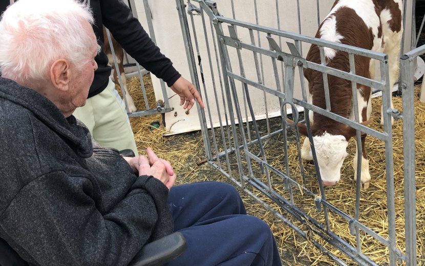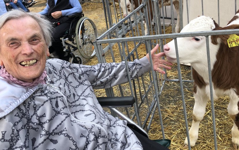 Die Tour der Bewohnerinnen und Bewohner des Hauses sowie die des betreuten Wohnens ging auf das Landgut Kemmler in Wankheim. „Ich bin Brigitta Kornelius als Vorsitzende des unseres Heimbeirates dankbar für die rundherum gute Organisation des Tags“, freut sich Regina Hönes, Einrichtungsleiterin des GPH. „Schon die gemeinsame Fahrt dorthin war für alle ein schönes Erlebnis.“ Auf dem Landgut angekommen, ließ sich die muntere Reiseschar Kaffee und Kuchen im Hofcafé schmecken. Die Stars des Tages waren aber eindeutig die kleinen Kälble, die sich über so viel Streicheleinheiten freuten. „Der Duft des Bauernhofes, die schönen Eindrücke des Tages, das gemeinsame Singen von Liedern – das war für alle wie ein Tag Urlaub“, so das Fazit von Regina Hönes.