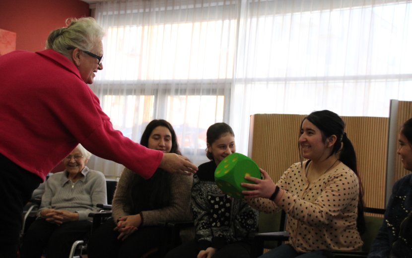 Erstaunlich gut klappte der Austausch in der riesigen Gruppe. Zunächst spielten alle zusammen unter Anleitung von Silke Klein, Soziale Betreuung, ein Spiel mit Rätseln und Liedern. Jeder der 28 Teilnehmer durfte den großen grünen Würfel werfen und Name, Alter und Herkunftsland sagen. Da ist der 17-jährige Evghenij aus Transnistrien, der 11-jährige Fabio aus Griechenland, die Schwestern Magdalina (14 Jahre) und Valentina (15 Jahre) aus Bulgarien. Andere Schüler kommen aus dem Irak, Syrien und Eritrea. Die Brüder Simone und Davide aus Italien. Auch bei den Senioren gibt es neben den vielen gebürtigen Denkendorfern einen Herrn aus Griechenland, eine Dame aus Siebenbürgen, eine Bewohnerin ist erst 71, die andere schon 96, die eine wohnt erst seit drei Tagen im Martin-Luther-Haus, andere schon mehrere Jahre.
