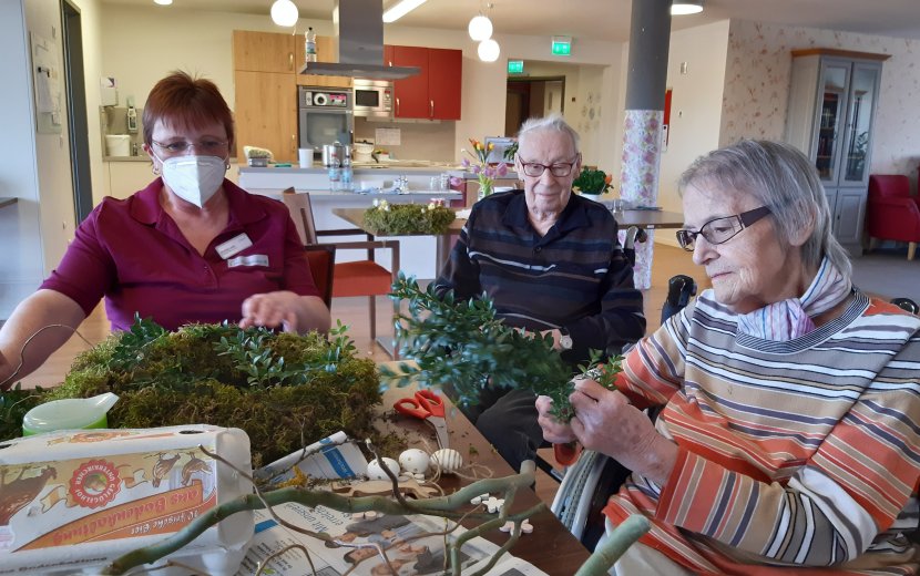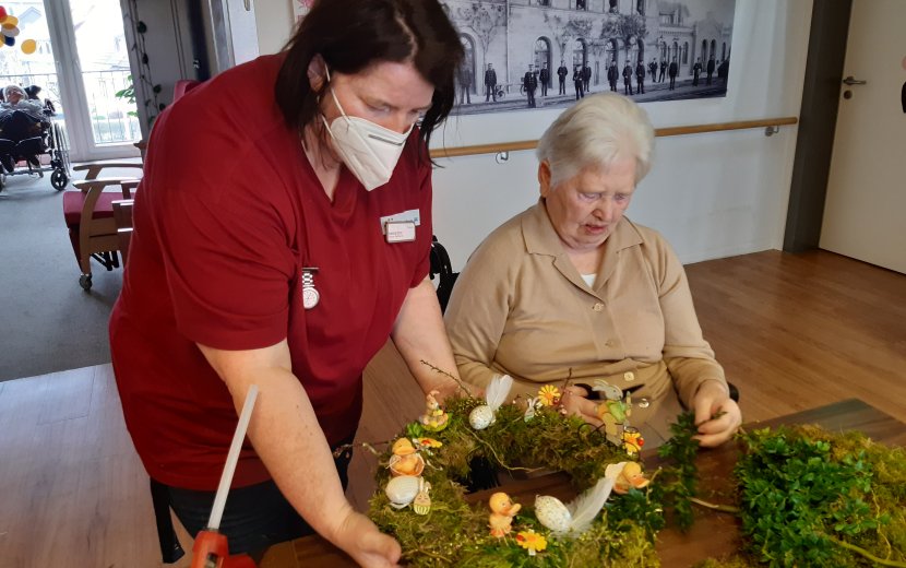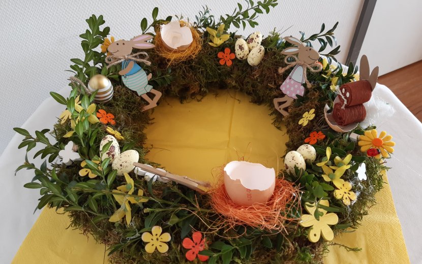 Heraus kamen individuell gestalteten Kränze, die so manchem bewundernde Kommentare entlockte. Vor allem die kleinen „Bibberle“ und Häschen wurden als "dermaßen goldig" betitelt. Auf jedem Wohnbereich wurden außerdem leckere Osterausstecherle gebacken und auch schon genascht. Vor dem Haus fand eine große Pflanzaktion statt. So ist das Taläcker nun bestens auf die anstehenden Osterfeiertage vorbereitet. "Leider dürfen wir keine Gottesdienste im Haus machen", erzählt Nathalie Wiedmann, Leiterin der Sozialen Betreuung, "stattdessen findet für jeden Wohnbereich eine Osterandacht statt."