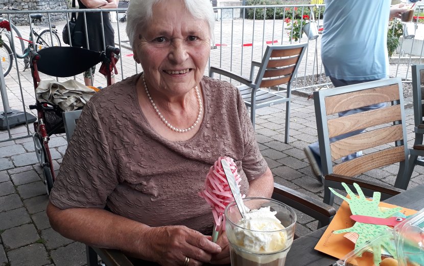 Eine Bewohnerin aus dem Haus am Brunnenrain freut sich bei leckerem Eiskaffee über die Post und die Basteleien von Schülerinnen und Schülern der Hohbergschule. (Foto: Johanna Fischer)