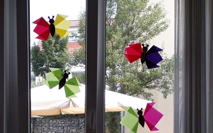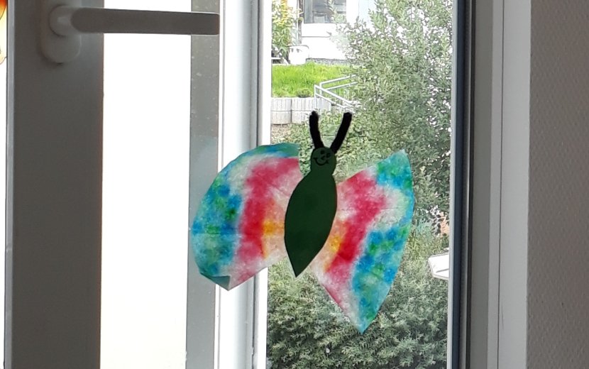 Mit Genuß öffneten die Bewohnerinnen vom Haus am Brunnenrain die Briefe, bestaunten die Basteleien, lasen die netten Worte oder ließen sie sich vorlesen. Die ein oder andere Erinnerung an die eigene Schulzeit kam ins Bewußtsein. Was für ein schöner Nachmittag! Am späten Nachmittag hängten die Mitarbeiterinnen der Sozialen Betreuung die Basteleien in den Wohnbereichen auf. Der ein oder andere Schmetterling aber fand seinen Weg in ein Bewohnerzimmer. Überall verschönern die tollen Basteleien nun die Fenster und fördern die gute Laune!