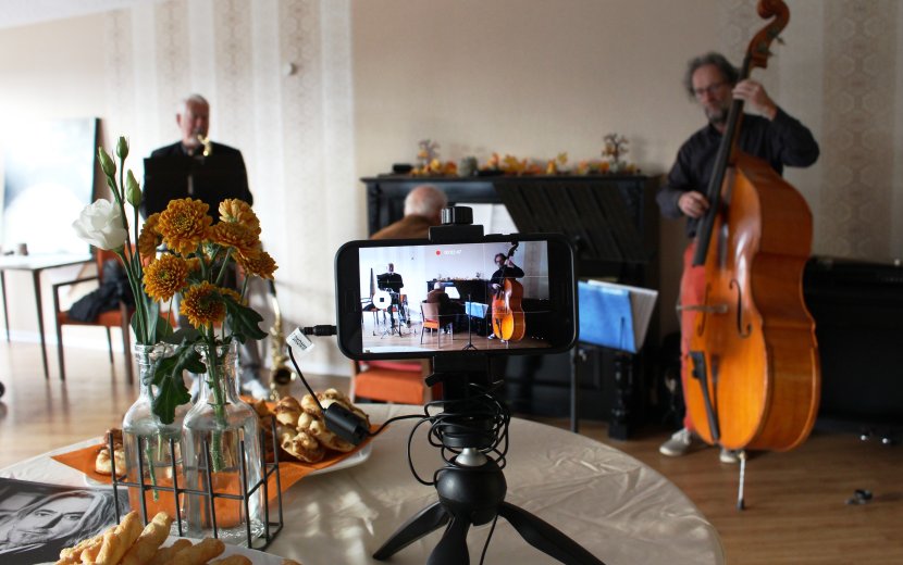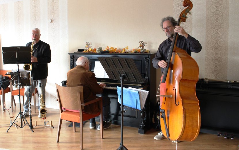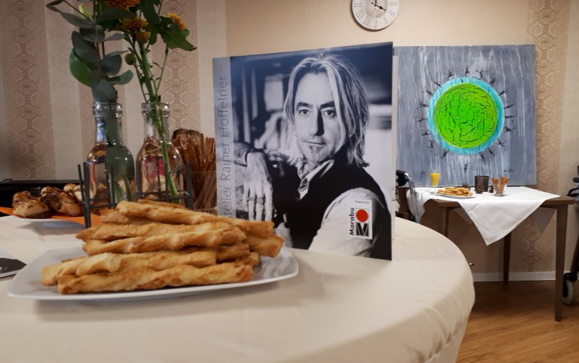 Bernhard Slenzka forderte in seiner Begrüßungsrede alle auf, durch die Einrichtung zu schlendern und sich die Werke anzusehen. „Uns ist es ein großes Anliegen, hier in der Gemeinde Wurzeln zu schlagen und ein Netzwerk aufzubauen zu Kulturschaffenden, um für unsere Bewohner eine Plattform zu bieten, interessante Menschen kennenzulernen, trotz des Alltags im Pflegeheim.“ Bei Häppchen und Sekt und der Musik vom Trio Vlasina aus Esslingen nahm der Nachmittag seinen Lauf und brachte Klänge, Farbe und ein bisschen Trubel in den Alltag der Bewohnerinnen und Bewohner.