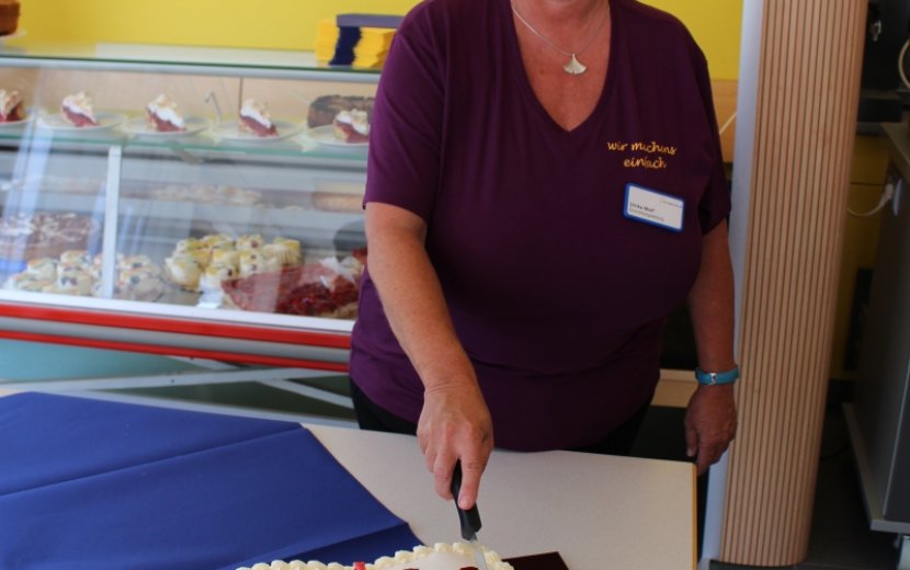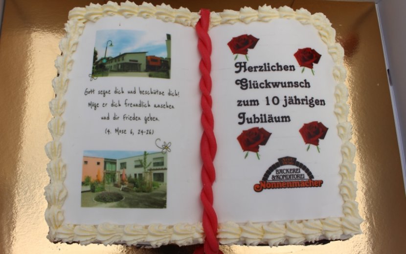 „Für mich war eine der größten Überraschung unsere Geburtstagstorte“, strahlt Einrichtungsleiterin Ulrike Wolf. Die Bempflinger Bäckerei Nonnenmacher hatte dem Seniorenzentrum eine außergewöhnliche Torte in Form einer Bibel geschenkt. „Gott segne dich und beschütze dich! Möge er dich freundlich ansehen und dir Frieden geben.“ – Dieser Spruch zierte neben den Glückwünschen die Torte.