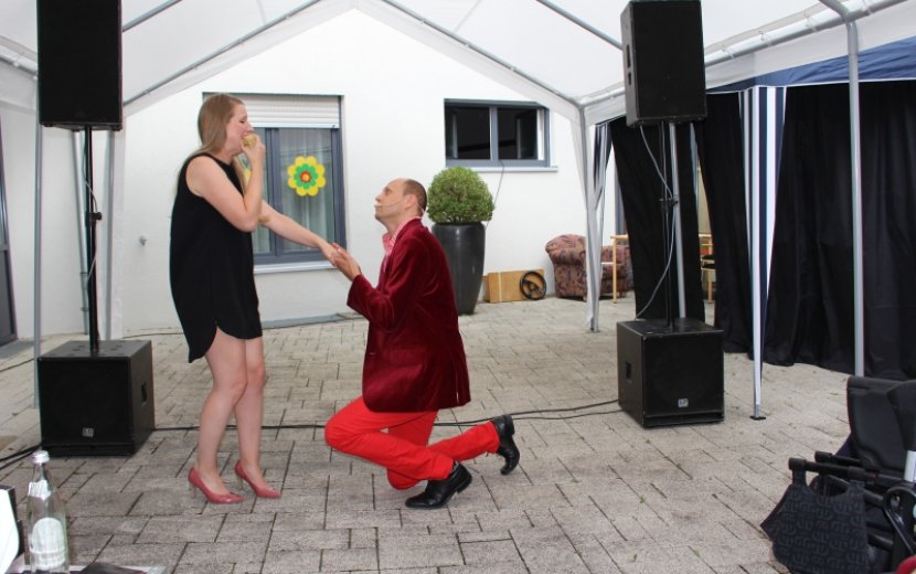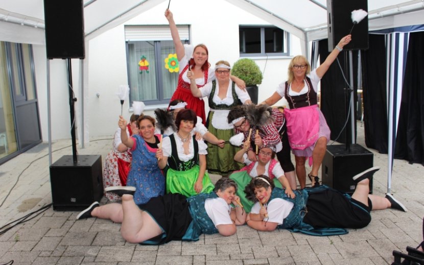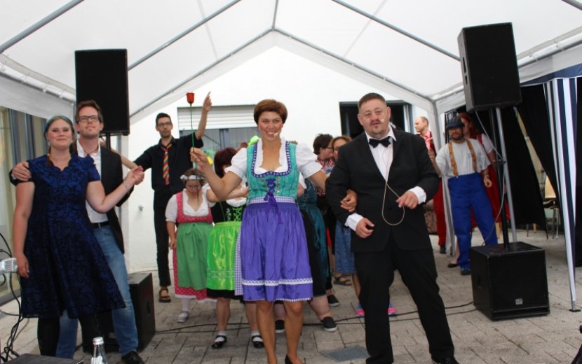 Das Highlight der Feier war sicherlich der Auftritt der integrativen Theatergruppe Steinachspatzen. Das „Weiße Rössl“ wurde aufgeführt. Und wer jetzt denkt, das kenn ich ja schon von Peter Alexander, der wurde von dieser Darstellung als modernes Improvisationsstück positiv überrascht. Die Theatergruppe aus Frickenhausen hatte keine Mühe gescheut und trat in einer „hochkarätigen“ Besetzung auf. So wurden eigens ein Spezialauftritt zweier Darsteller als Helene Fischer und Florian Silbereisen inszeniert, die mit ihrem Heiratsantrag aus Alterssicherungsgründen bei den Gästen ein lautes Gelächter erzielten. Auch die bekannten Ohrwürmer vom Originalstück „Weißes Rössl“ und von Helene Fischer sorgten für eine tolle Stimmung und der einen oder anderen Tanzeinlage unter den Gästen.