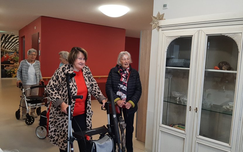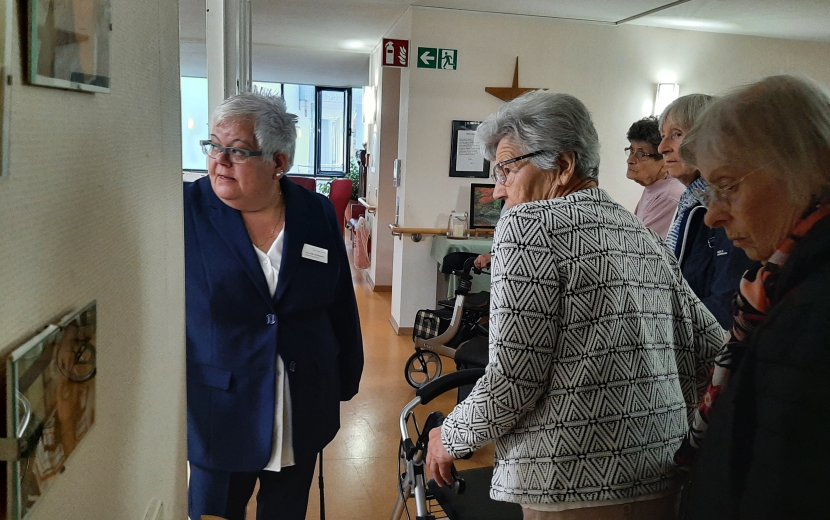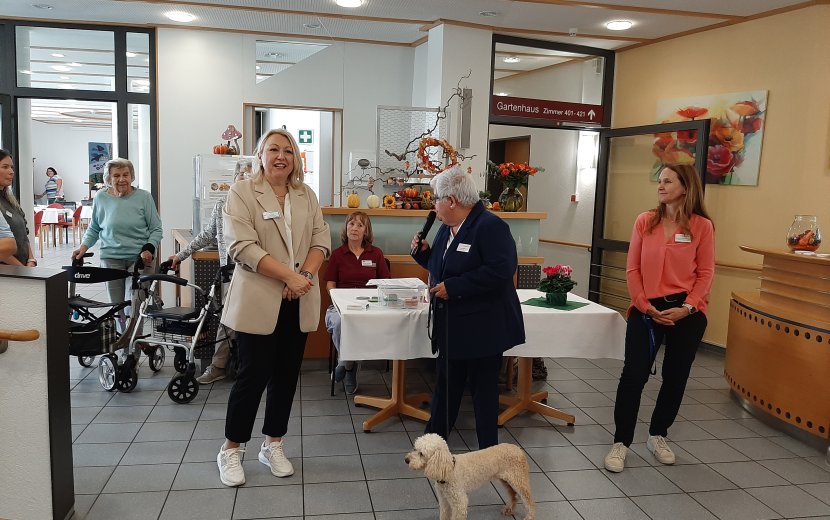 Einrichtungsleiterin Marcelle Hofmann lädt gerade zur dritten und vierten Hausführung ein, zehn interessierte Gäste gehen mit ihr durchs Haus, neun weitere mit ihrer Stellvertreterin Eveline Eichenbrenner. Es geht auf einen der beiden Wohnbereiche, am Speisesaal vorbei in das Zimmer von Frau Günther, die sehr gerne die Fragen der Gäste beantwortet und stolz ihre tollen Möbelstücke zeigt, die ihr Zimmer schmücken. Auch der großzügige Demenzbereich wird besucht, viele Fragen beantwortet. "Es ist wirklich sehr schön hier und es riecht sehr gut", bemerkt eine Seniorin mit Rollator. Neu ist der kleine, sehr schön eingerichtete Ruhe-Raum für Tagespflegegäste mit Demenz. "Unsere Tagespflegegäste werden in den Wohnbereich integriert und betreut. Wenn sie Ruhe brauchen, können Sie sich hierher zurückziehen", erklärt Marcelle Hofmann das Konzept der integrierten Tagespflege.