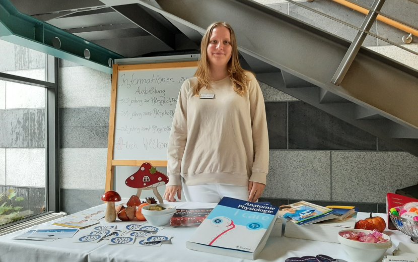 Nach der Führung begibt sich auch diese Gruppe zum Essen, während neue Gäste kommen und sich entweder bei Paschalina Escher und Thomas Deiss Infos zum Ambulanten Pflegedienst Schorndorf holen, die jungen Mitarbeitenden gleich am Eingang nach den Ausbildungsgängen befragen oder am Infostand des Fördervereins über Möglichkeiten zum Ehrenamt informiert werden.