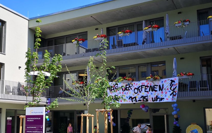 Die Sonne scheint. Die Blumen an den Balkongittern blühen. Ein bunt gestaltetes Banner lädt zum Tag der offenen Tür ein. Eine Hausführung reiht sich an die andere. Ein Interessentengespräch an das andere. Es herrscht ein angenehmes und ständiges Kommen und Gehen.