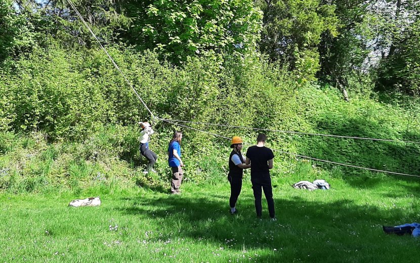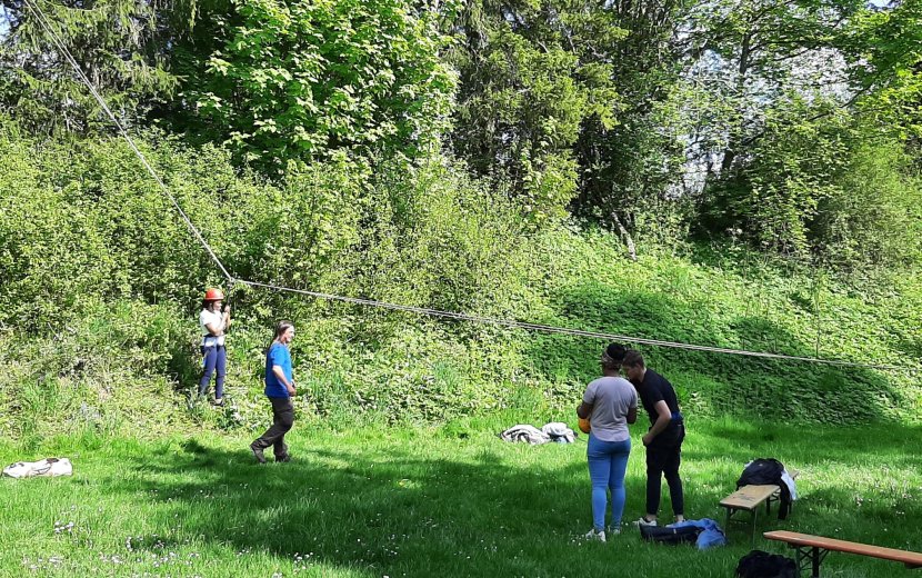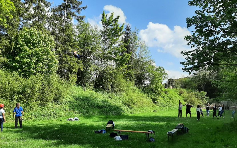Dieses beinhaltete ein erlebnispädagogisches Teamtraining. Für die Heilerziehungspflegerinnen und -pfleger, Arbeitserzieherinnen und -erzieher sowie Heilerziehungsassistentinnen und -assistenten gab es so manche große und kleine Aufgaben und Herausforderungen gemeinsam zu lösen. Highlight für alle war ein kurzer Flug nach oben, der nur Dank geeinter Gruppenstärke und unter Anleitung von zwei Erlebnispädagogen funktionieren konnte!