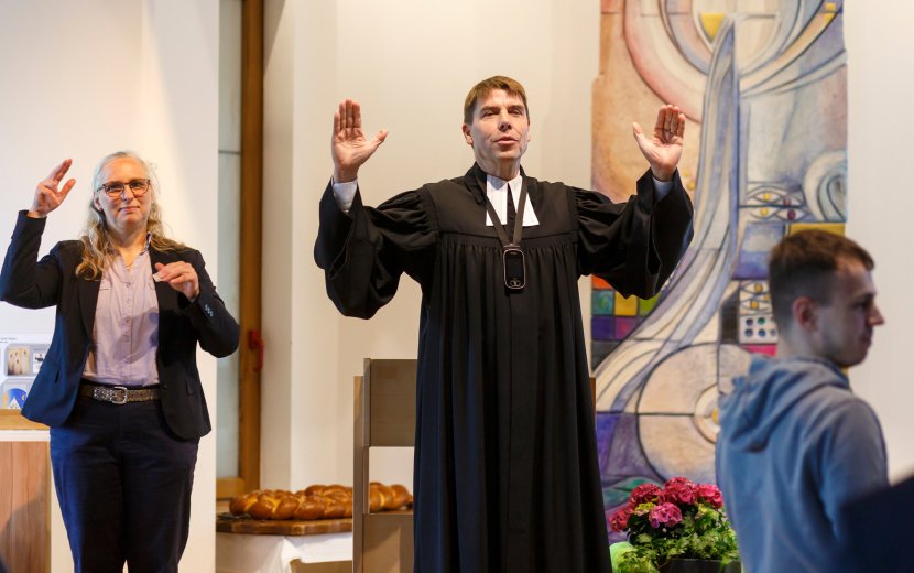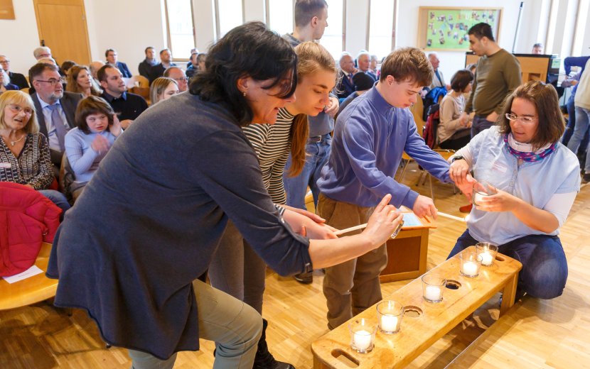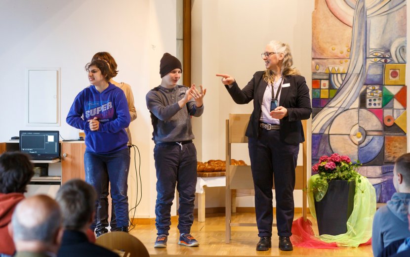 Die Feier ist von Schülerinnen und Schülern des SBBZ Haslachmühle mit vorbereitet worden – mit Gebeten für den Gottesdienst und mitreißenden musikalischen Einlagen. Gemeinsam mit Direktorin Sonja Fahrbach und Internatsleiter Matthias Oesterle, die einen Einblick über das pädagogische Konzept der Schule gaben, demonstrierteein Schüler auch, wie mittels der technischen Unterstützung eines Tablets kommuniziert werden kann.