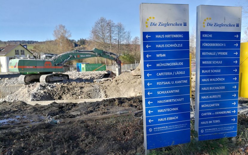 Die Bauarbeiten für die neue Heidi-Ziegler-Schule haben begonnen. Der Neubau ist Teil der umfassenden baulichen Veränderungen auf dem Gelände der Haslachmühle und wird durch das Land Baden-Württemberg gefördert. Dafür wurden die alten Häuser Eichhölzle und Hirtenberg abgerissen. 2022 soll die Schule mit Wohnhaus für Kinder und Jugendliche mit intensiv pädagogischer Begleitung fertig sein. Namensgeberin ist Heidi Ziegler, eine frühere Mitarbeiterin der Behindertenhilfe, die die Kommunikation mit Gebärden wesentlich prägte. Außerdem wurde eine Ampel und die Limitierung auf Tempo 30 angebracht, um Bewohner wie Bauarbeiter zu schützen.