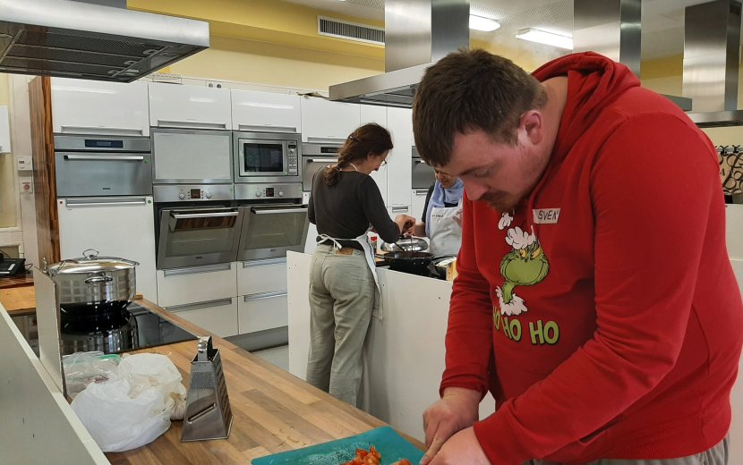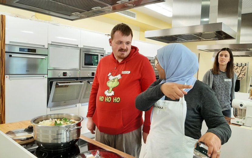 In der Schulküche herrschte ein buntes Treiben, denn es trafen Menschen unterschiedlicher Nationen, unterschiedlichen Alters und Menschen mit und ohne Assistenzbedarf aufeinander. Unter Anleitung der Küchenchefin Chaymaa Haddadi wurden alle bei der Essenszubereitung eingespannt. Es wurde fleißig Gemüse geschnippelt, Salat geputzt, Teig ausgerollt, verschiedene Zutaten gekocht und Schritt für Schritt die einzelnen Speisen fertiggestellt. Dabei kam auch der Austausch untereinander und der Spaß nicht zu kurz.