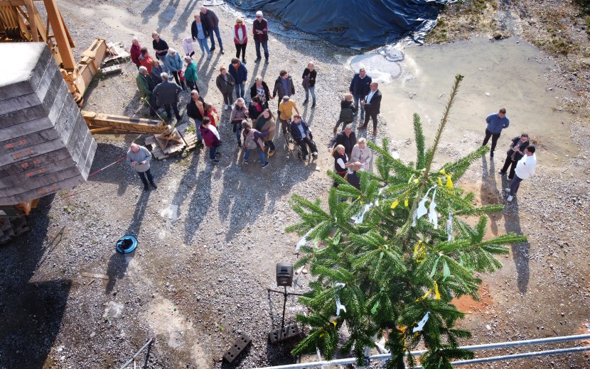 Bewohnerinnen und Bewohner, Mitarbeitende und Baubeteiligte, Vertreter des Ortschaftsrates sowie der Nachbarschaft sind der Einladung zum Richtfest gefolgt.