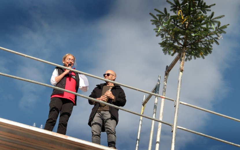 In luftiger Höhe: Der Richtspruch markierte die Rohbau-Fertigstellung des neuen Wohngebäudes der Behindertenhilfe in Obereschach. (© Bernhard Wrobel / Die Zieglerschen)
