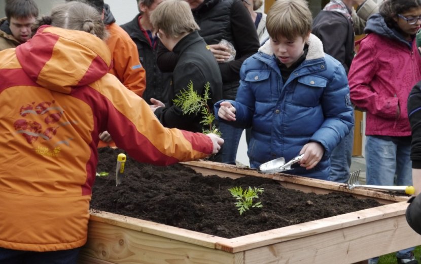 Die Schüler des SBBZ Haslachmühle der Zieglerschen freuen sich über das Hochbeet, in dem sie nun Samen zu Pflanzen, Kräutern und Gemüse ziehen werden. Herr Eisenhardt und seine Kollegen werden in den kommenden Jahren vielen Schülern die Möglichkeit geben können, mit diesem PflanzenWelten-Hochbeet zu arbeiten. Das rollstuhlgeeignete Hochbeet ist von zwei Seiten aus unterfahrbar, zugleich kann es auch von den Längsseiten her im Stehen bearbeitet werden.
