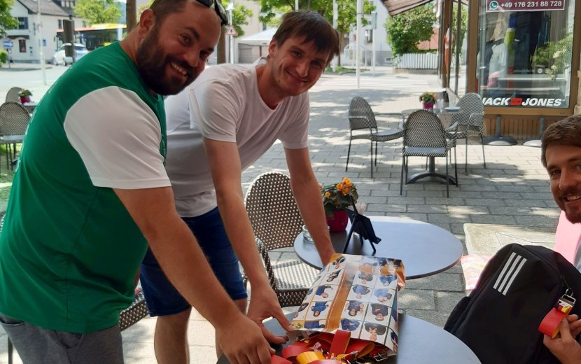 Entgegengenommen haben die besonderen Unikate Raphael Stäbler vom gleichnamigen Café und Mitarbeiter Dennis Kutzner. Während Stäbler gleichzeitig Trainer der Wilhelmsdorfer Beachvolleyball-Mannschaft der Special Olympics ist, ist Kutzner dort Spieler – wie Eninger im Übrigen auch.