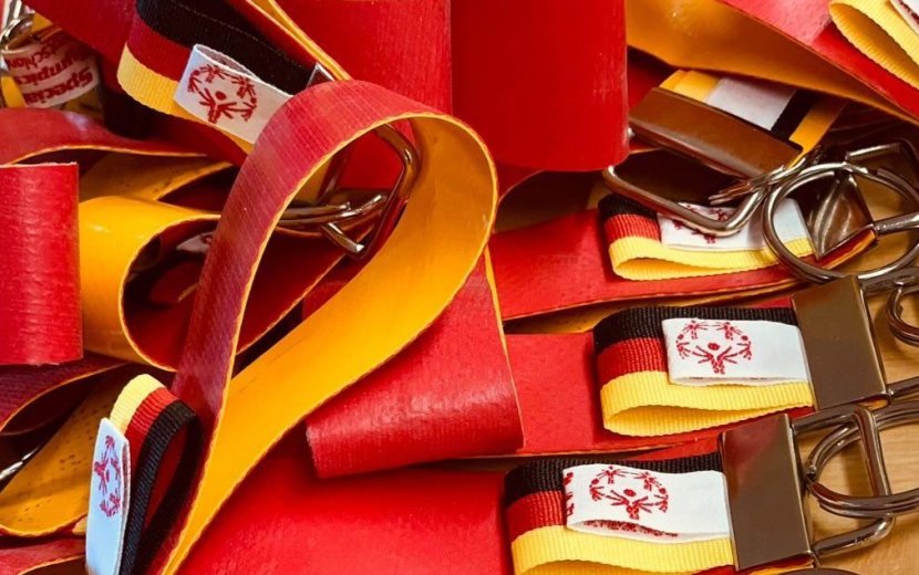 Nachhaltig sind die WfbM- Schlüsselanhänger übrigens auch, denn das Material hierfür stammt von einem ausgemusterten Airtramp (Hüpfkissen) aus der Haslachmühle. Upcycling pur. Drei Tage lang hatten die jungen Männer unter vollem Einsatz daran gearbeitet, damit diese rechtzeitig zu den Spielen fertiggestellt sind.