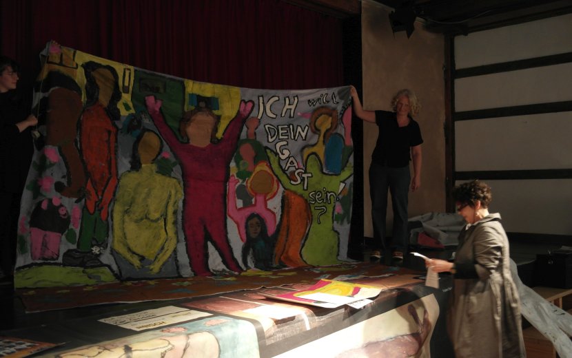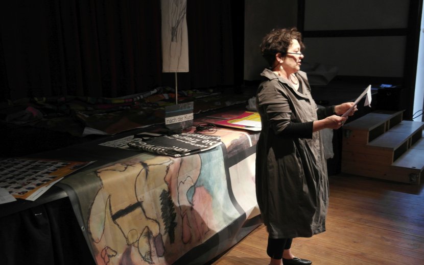 Mit einer Outdoor-Ausstellung auf Bauzäunen unter dem Motto „Auf der Suche nach der Kunst“ startete das Kunstprojekt. Im Rahmen der letzten der insgesamt sieben Kunstaktionen sind unter dem Motto „Hey, da machen wir was draus“ fast alle 17 Bauzaunbanner bei einem Nähprojekt zu Taschen und Täschchen, Lampen, Blumenampeln und vielem mehr verarbeitet worden. Gebärden rund um die Kunst waren Thema eines Fotoshootings, zu dem Models aus der Malwerkstatt im farbverschmierten Malerkittel ins Fotostudio von Karin Volz nach Ravensburg gekommen sind. Ergebnis waren ein Arbeitsheft und ein Gebärdenplakat, das Ingrid Mathijssen den Besuchern der Vernissage zeigte. So mancher fand sich auf dem Plakat voller Freude wieder.