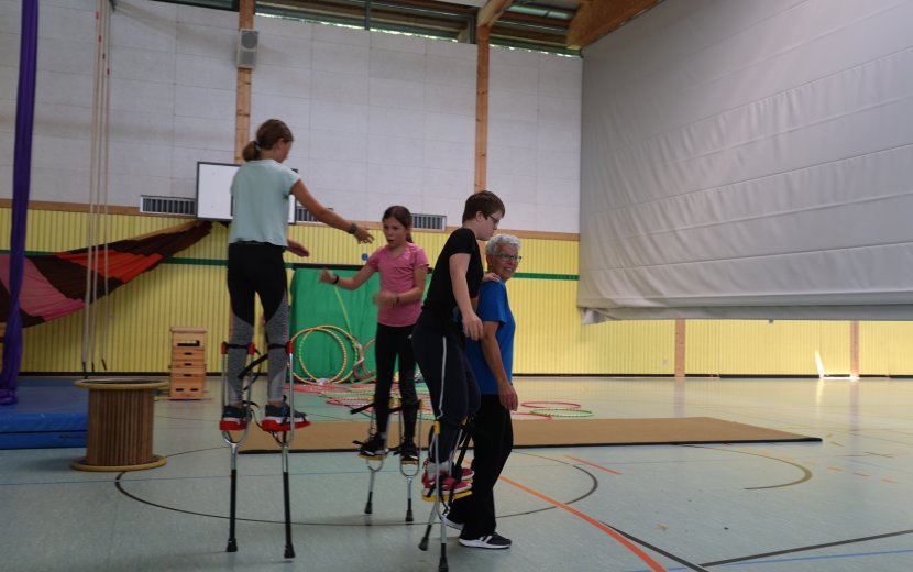 Die Sporthalle der Grundschule in Aulendorf hat sich Ende August kurzzeitig in eine Artistenschule verwandelt: Seile hingen von den Decken, Schutzmatten waren ausgebreitet, bunte Tücher und Balancierelemente waren überall verteilt.
