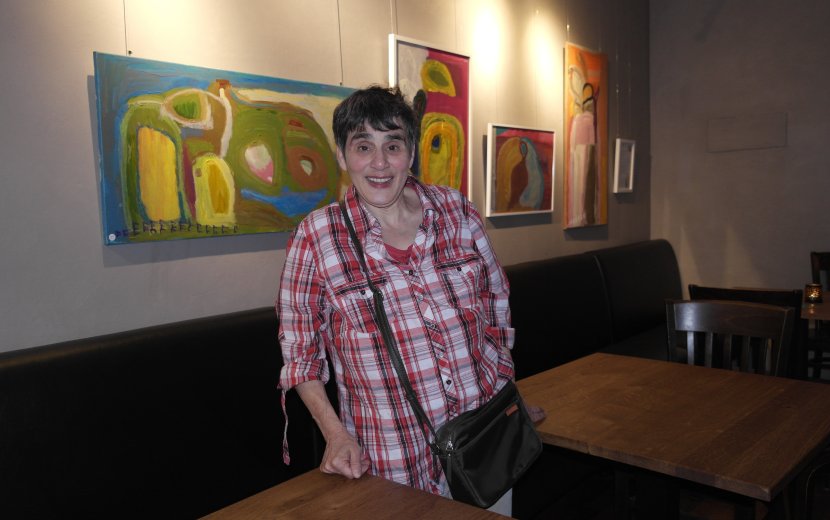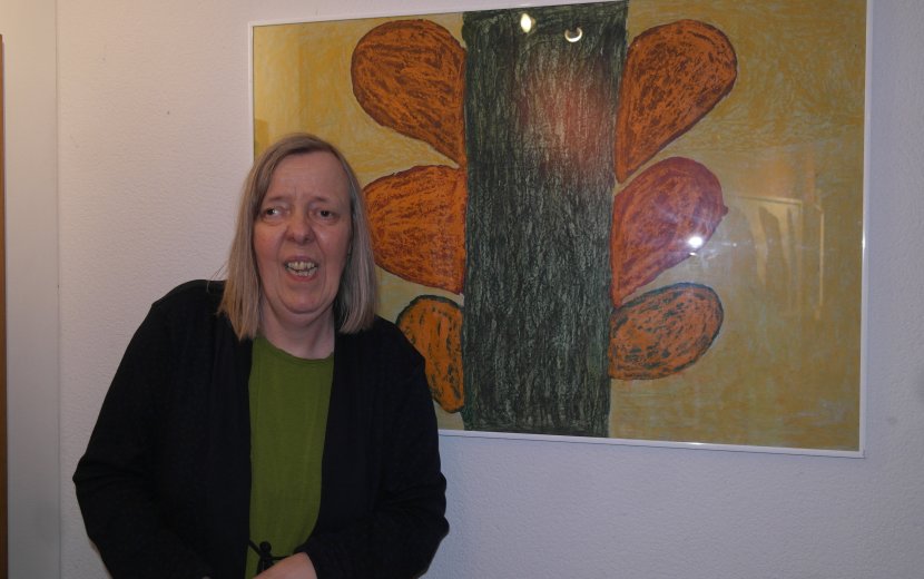 Mit einer ganzen Reihe von „EEEEs“ signiert Efklia Grigoriadou jedes ihrer Werke. „In ihrer abstrakten Malerei zeigt sie Elemente, in denen der Betrachter intuitiv konkrete Gegenstände oder Situationen zu sehen glaubt“, erläuterte Silke Leopold. Gegenüber hängen Gemälde von Thomas Zinke, der seine Leidenschaft für Gummi in knallbunte, fröhliche Farben gießt. Pinselstrich für Pinselstrich fülle er die Farbe in den Gedanken der Form hinein, berichtete die Leiterin der Malwerkstatt von Zinkes Schaffensprozess. Auf der Empore hängen die Bilder von Kira Klemenz, die für ihre Farb- und Formspiele Greifbares und Existierendes suche. „Das kann ein Geflecht sein oder auch andere Dinge, die sie unmittelbar umgeben. Im Malprozess verlieren sie ihre Bestimmung.“