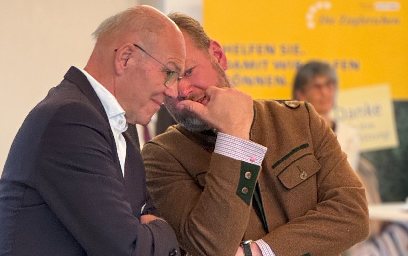 Es war vor allem ein Tag der Begegnung und des Miteinanders, etwa zwischen Rolf Baumann, dem die Initiative zur Stiftungsgründung zu verdanken ist, und Dietmar Büschl, der zuletzt in den Kreis der Stifter aufgenommen wurde. Als Gratulanten traten neben dem Haus- und Schlossherrn, Ferdinand Graf von Waldburg auch Kißleggs Bürgermeister Dieter Krattenmacher auf. Er überreichte ein Geburtstagsgeschenk der Stadt in Form einer Spende. Einen besonderen Beitrag leistete Barny Bitterwolf mit seiner Moderation und einem musikalischen Auftritt. Der oberschwäbische Barde ist der Johannes-Ziegler-Stiftung seit vielen Jahren als Unterstützer verbunden. Am Ende fasste es der Stiftungsrats-Vorsitzende Werner Baur so zusammen: »Ein ganz besonderer Tag in wunderschönen Räumlichkeiten, liebevoll und mit Hingabe vorbereitet, erfüllt mit dem Spirit des Miteinanders. Nicht nur eine sehr gelungene Jubiläumsfeier, eine erfüllte Zeit!«