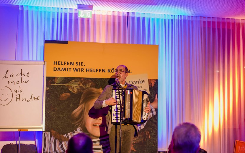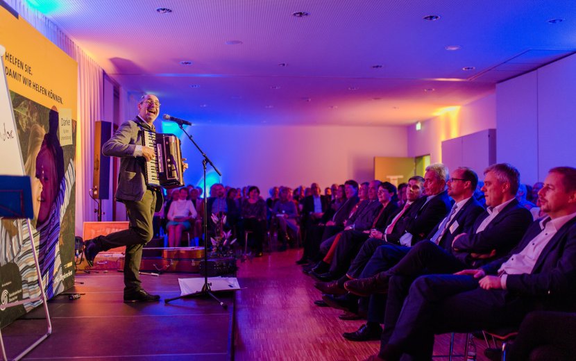 „120 begeisterte und zufriedene Gäste, tosender Beifall und glückliche Patientinnen und Menschen mit Behinderung – diese Veranstaltung war ein voller Erfolg“, freut sich Stiftungsvorstand Gottfried Heinzmann über den gelungenen Auftritt „Xond und gfräs“ von „Barny“ Bitterwolf. Mit viel Witz und Humor gibt der über den SWR bekannte oberschwäbische Barde nicht ganz ernstgemeinte Ratschläge, mit denen das persönliche Wohlergehen gesteigert werden soll. Mit großem Spaß und auf einer spielerischen Ebene stellt Bitterwolf seinem Publikum, darunter die Bad Saulgauer Bürgermeisterin Doris Schröter, Übungen vor, deren nachhaltige Wirkung zwar nicht erprobt ist, aber eines allemal bewirken. Die Lachmuskulatur wird gestärkt: Lustvoll schwäbisch. Ob Benefizauftritt oder Schirmherr für die Ravensburger Vesperkirche – der Bad Waldsee’er Bitterwolf, seit Oktober Träger der Staatsmedaille in Gold der Landesregierung, ist seit vielen Jahren eng mit den Zieglerschen verbunden. Durch die Begegnung mit den Menschen kommt es zu wertvollen Erfahrungen, die einem nicht mehr genommen werden können, sagt er über sein Engagement für die soziale Einrichtung. Rolf Baumann, ebenfalls Stiftungsvorstand, dankt Bitterwolf von ganzen Herzen: „Ihre Verbundenheit ist ein starkes Zeichen der Solidarität mit Menschen, die nicht auf der Sonnenseite des Lebens stehen. Und unseren Kollegen, die die wichtige Arbeit in der Betreuung, Beratung und Pflege leisten, signalisieren sie durch ihren Einsatz: Sie machen einen wichtigen Job. Vergelt´s Gott.“