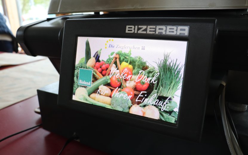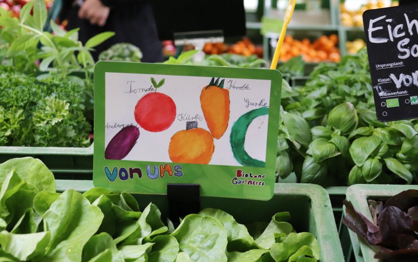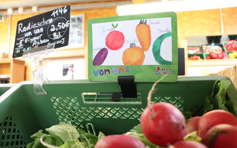 Mit selbstgestalten Produktschildern zeichnet die Rotach-Gärtnerei Salat, Gemüse und Obst aus eigenem Anbau aus. Die Künstlerinnen und Künstler der Miniaturzeichnungen sind Mitarbeitende mit Assistenzbedarf der Zieglerschen Bioland-Gärtnerei. Angeleitet wurden sie von der NEULAND-Malwerkstatt. Wie viele Produkte der Rotach-Gärtnerei stehen die Arbeiten unter dem Motto „Von uns“.