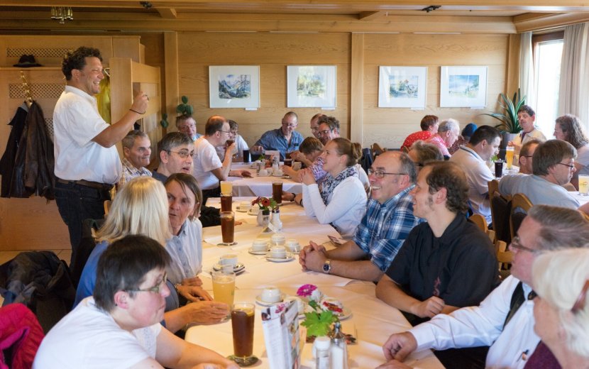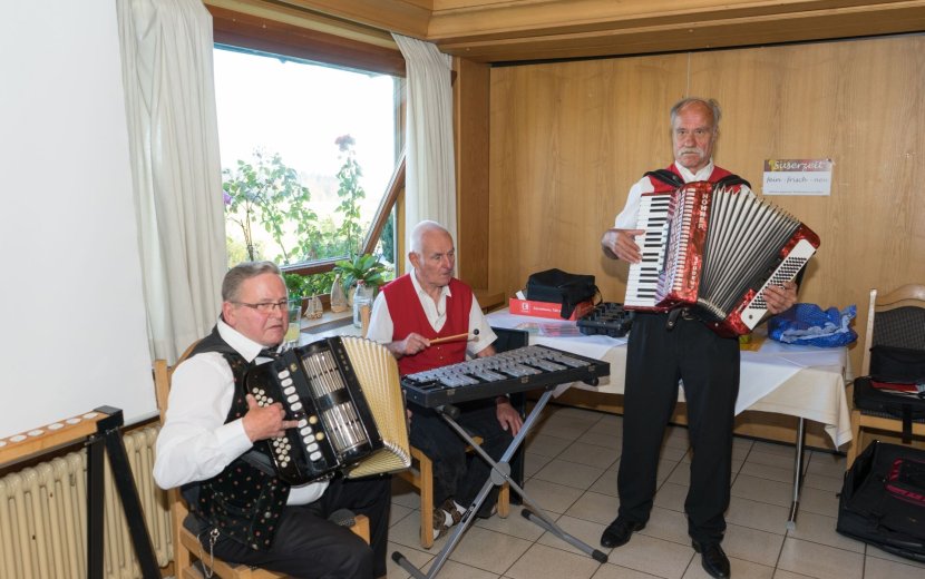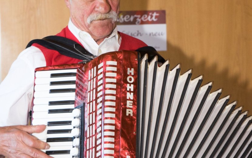 Bereichsleiter Olaf Sigmund hat am 18.10.17 in den Berggasthof Höchsten zur Ehrung der vielen langjährigen Beschäftigten eingeladen. Begonnen hat die Feier mit einer Andacht. Dabei hat sich Sigmund bei den Beschäftigten für ihre Zuverlässigkeit, ihren Einsatz und ihr Vertrauen bei der Arbeit in den Werkstätten bedankt. Dann folgten die Ehrungen: für 10, 20 Jahre und dann im 5-Jahres Schritt bis hin zu ganzen 50 Jahren Tätigkeit in der Werkstatt. Diese besondere Auszeichnung wurde Walter Muhlke zuteil. Dafür hat er sich aber auch extra bei seinem Kostenträger stark gemacht. Eigentlich sollte er noch vor seinem Jubiläum in die wohlverdiente Rente gehen und in den Seniorenbereich der Behindertenhilfe wechseln. Doch Muhlke konnte seine Arbeitszeit in der Werkstatt Aulendorf nochmals verlängern. Das feierte er bei der Ehrung dann besonders: mit der Band Rotachtaler unterhielt er die Gäste und stellte sein Talent am Akkordeon unter Beweis.