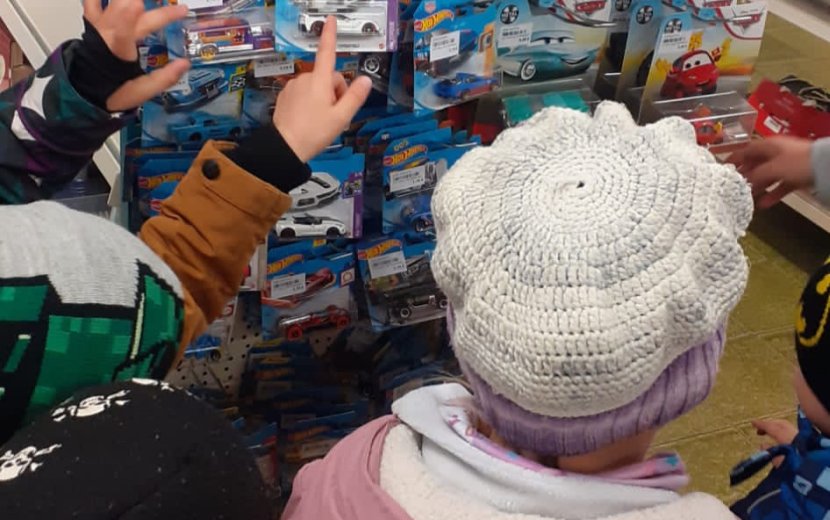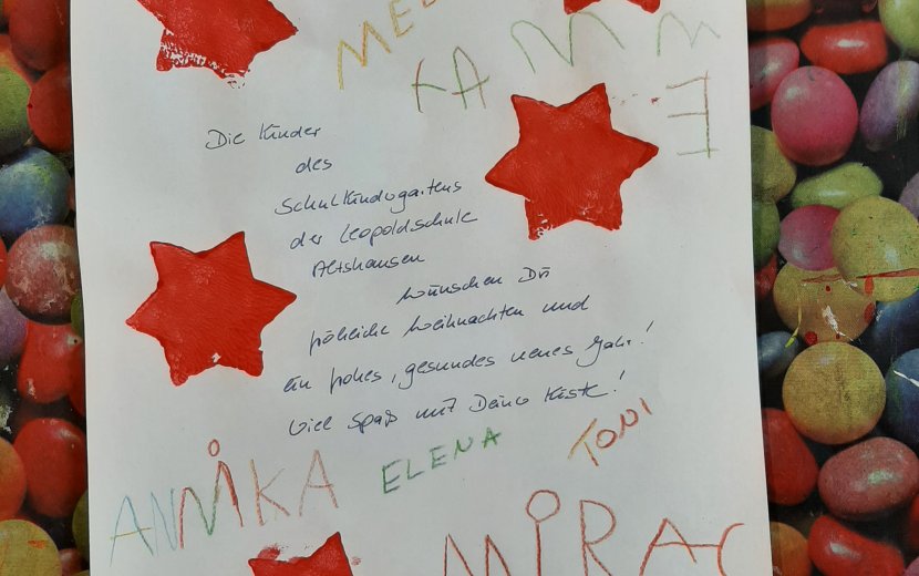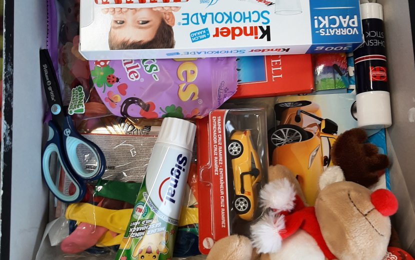Wir entschieden uns für die Aktion „Weihnachten im Schuhkarton“ von Samaritan´s Purse e.V. Gemeinsam hat jede Gruppe des Schulkindergartens einen Schuhkarton schön gestaltet und ging anschließend im Ort passende Dinge zum Spenden einkaufen. Die Kinder kauften Kuscheltiere, Zahnbürsten, Handschuhe, Haargummis, Legos, Duschgel und natürlich leckere Süßigkeiten. Stolz erzählten sie den Ladenbesitzern, dass sie die Spielsachen nicht für sich selbst, sondern für Kinder, die selbst nicht viel haben, besorgen wollten.