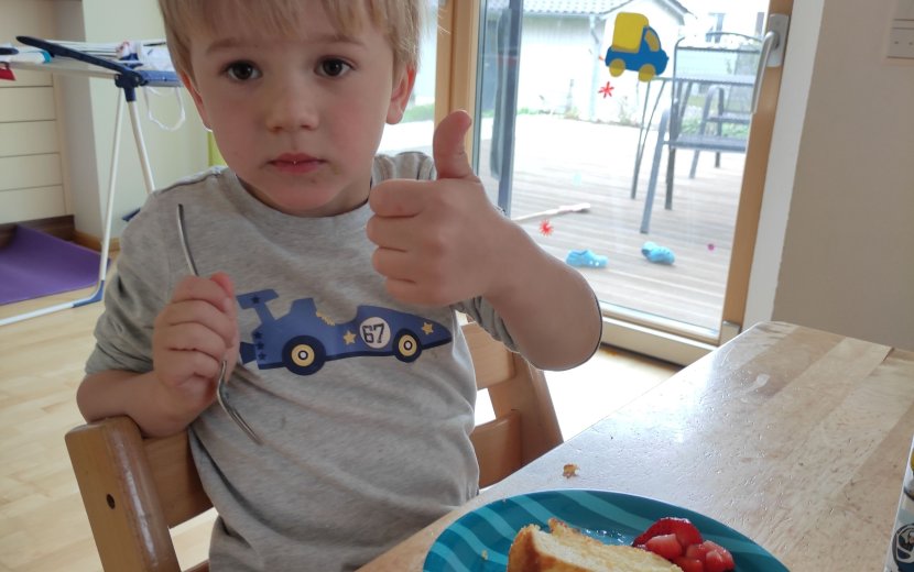 Ich steh jeden Tag früh auf, denn Ausschlafen ist nicht mein Ding. (Mama ist schon ein bisschen genervt, weil sie muss mit meinen Schwestern Homeschooling machen). Dann frühstücke ich ausgiebig.