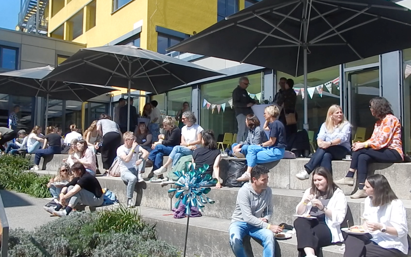 Bei mildem Frühlingswetter gab es auch zwischen den Vorträgen und Workshopangeboten Gelegenheit zum fachlichen Austausch. Am Stand des Verlags am Sprachheilzentrum konnte man sich über bewährtes und über neues Material informieren.