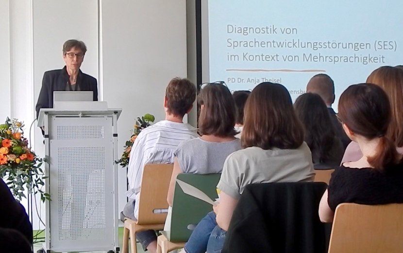 In zwei wissenschaftlichen Fachvorträgen konnten sich die Teilnehmenden auf den neuesten Stand der Diagnostik im Förderschwerpunkt Sprache bringen lassen. Dr. Anja Theisel referierte über das Thema ‚Diagnostik von Sprachentwicklungsstörungen (SES) im Kontext von Mehrsprachigkeit ‘ und JunProf. Dr. Heiko Holz nahm sich des Themas ‚Digitale Tools und künstliche Intelligenz in der Diagnostik früher literaler Fähigkeiten und des Schriftspracherwerbs ‘ an. Ergänzt wurde die Veranstaltung von zwei Workshoprunden mit praxisnahen Inhalten zu verschiedensten Aspekten der sprachheilpädagogischen Diagnostik. Hier waren auch einige Kolleginnen und Kollegen aus dem Hör-Sprachzentrum beteiligt.
