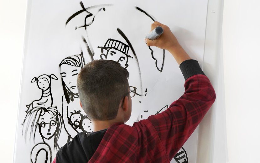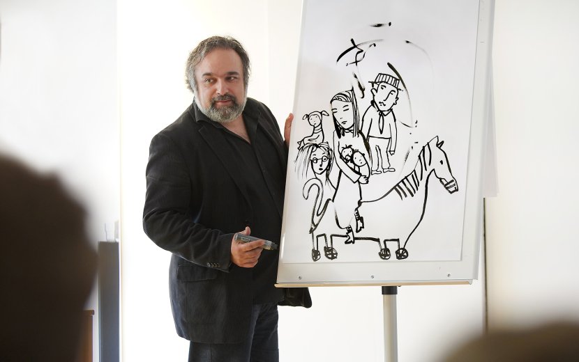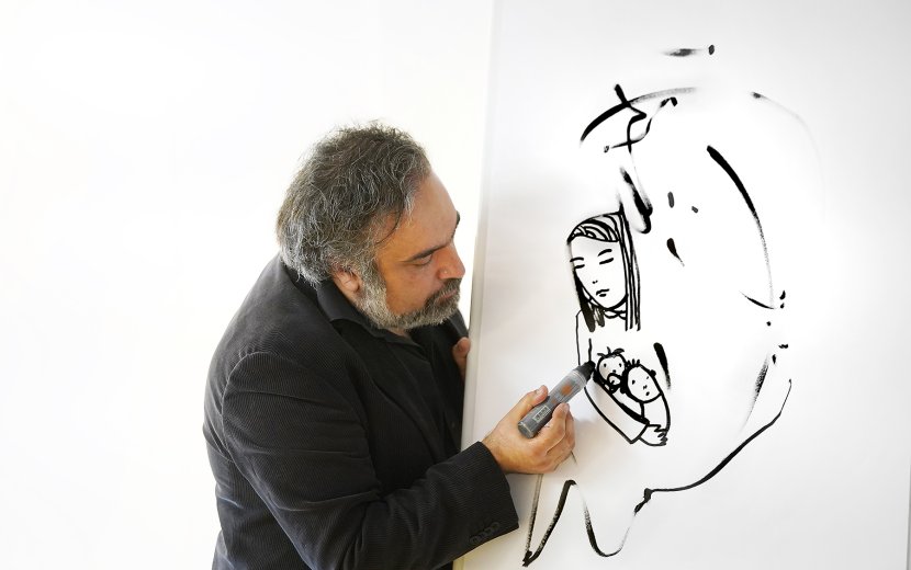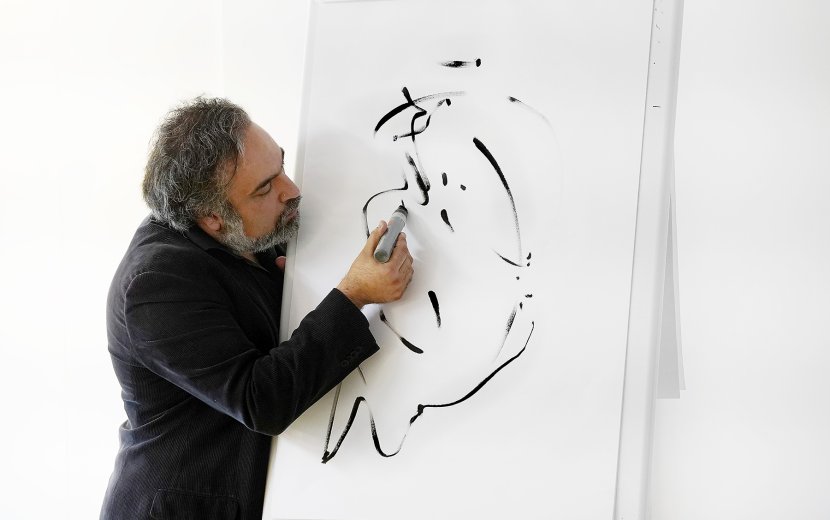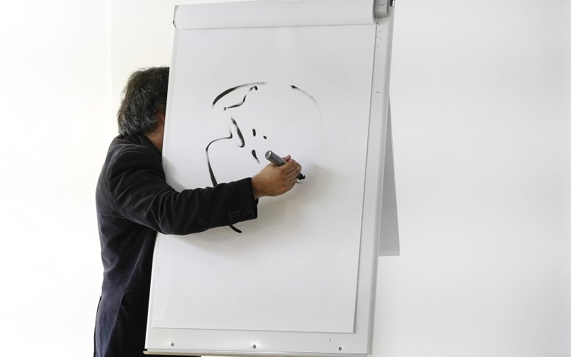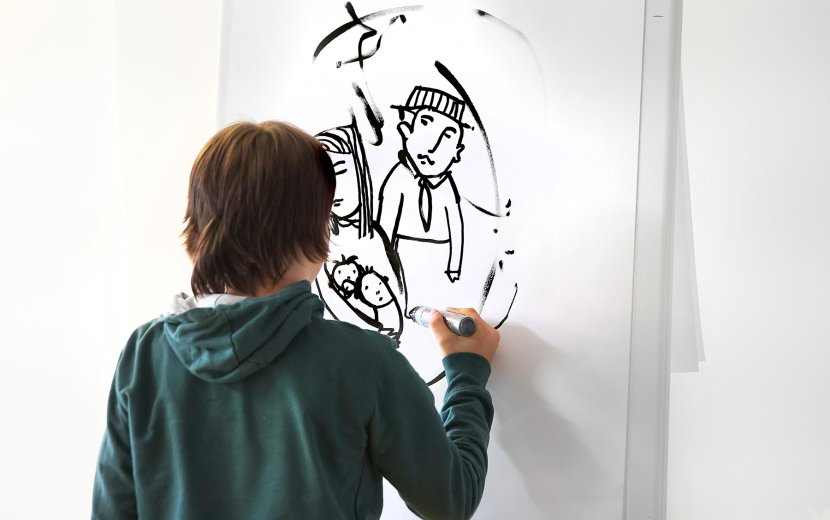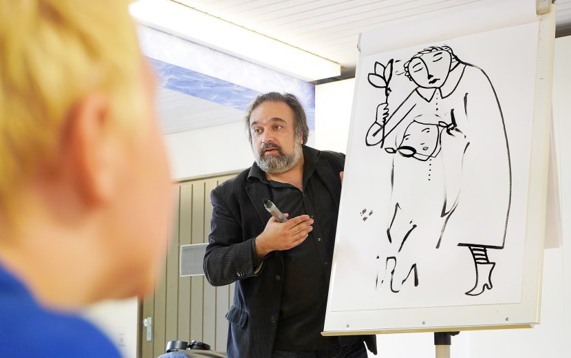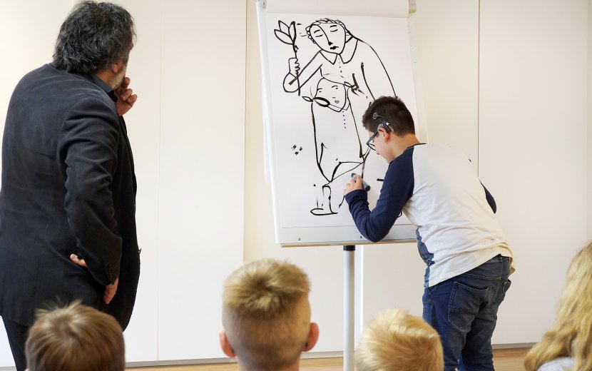 „Aus allem, was dir das Leben hinwirft, kannst du etwas Einzigartiges und Wunderschönes schaffen, wenn du bereit bist, zu akzeptieren, und genau hinzuschauen“, sagt der Illustrator Mehrdad Zaeri und zeigt den Schülerinnen und Schülern auch gleich, wie das geht. | Foto: Anja Koehler