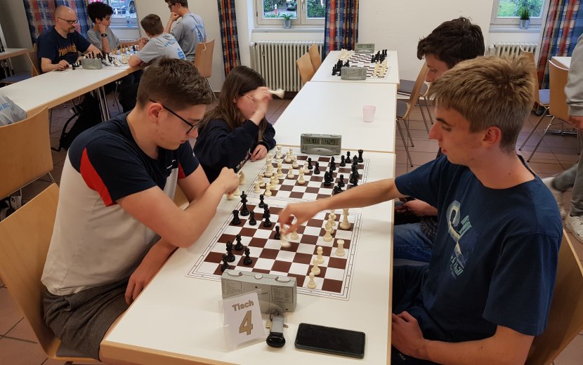 Am 2. Spieltag erwarteten uns mehrere starke und motivierte Mannschaften. Mit einer guten Portion Konzentration und zäher Verteidigung konnten wir der starken Mannschaft aus Hasbergen (Osnabrück) ein 2 zu 2 abringen, wobei Noah und Tristan sich durchsetzen konnten. Nach der Mittagspause kam dann unser entscheidendes Spiel gegen Nürnberg. Nach anfänglich guter Stellung an allen Brettern konnte letztendlich nur Mark punkten. In einer noch haltbaren Stellung passierte Juan ein Fingerfehler, indem er bei der auszuführenden Rochade zuerst mit dem Turm berührte und dann mit ihm rochierte. Das war leider regelwidrig, denn bei einer auszuführen Rochade muss zuerst der König gezogen werden. Letztendlich musste er mit dem Turm ziehen (Regel: Berührt – Geführt) und verlor die Partie. Somit rutschten wir vom 2. Platz auf den geteilten 3. Platz. Nach einem Gespräch mit dem russischstämmigen Nürnberger Trainer, sprach dieser vom „Wunder von Kassel“. Ernüchtert vom Verlust bereiteten wir uns auf unsre nächste gegnerische Mannschaft aus Bad Krozingen vor, bei der Michael die Spieler vor einem zwei Köpfe kleineren Mädchen warnte. Nicht zu erwarten, löste die ausgesprochene Warnung achtsam zu spielen bei unserem Spieler Angst hervor und er wurde nach ca. 10 Zügen Matt gesetzt. Nachdem auch Paul seine Partie verloren hatte, stand am Ende dann ein 2 zu 2 fest.